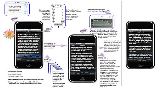Interactive Data QuoTrek by eSignal (for iPhone) Interactive Data Mobile provides global, streaming real-time financial quotes, charts and news to a variety of mobile devices. Interestingly they introduced a wireless, hand-held device offering real-time, streaming quotes and news back in 1983! Now that is mobile first design. Mental Models helped Interactive Data’s Desktop Solutions port this application, already popular on the BlackBerry platform, to the iPhone and iPod Touch. In doing so, we took advantage of the standard iPhone gesture language and accelerometer capabilities to increase usability by—among other things—emphasizing the interconnectedness of the data types, while also adding enhanced functionality. QuoTrek is currently available in the iTunes Store. ![]() QuoTrekThis was "old school" responsive design. ![]() Use CasesAs with all design, but in particular mobile design, it all starts with use cases to understand the most intuitive and efficient navigation for the user. | |||||